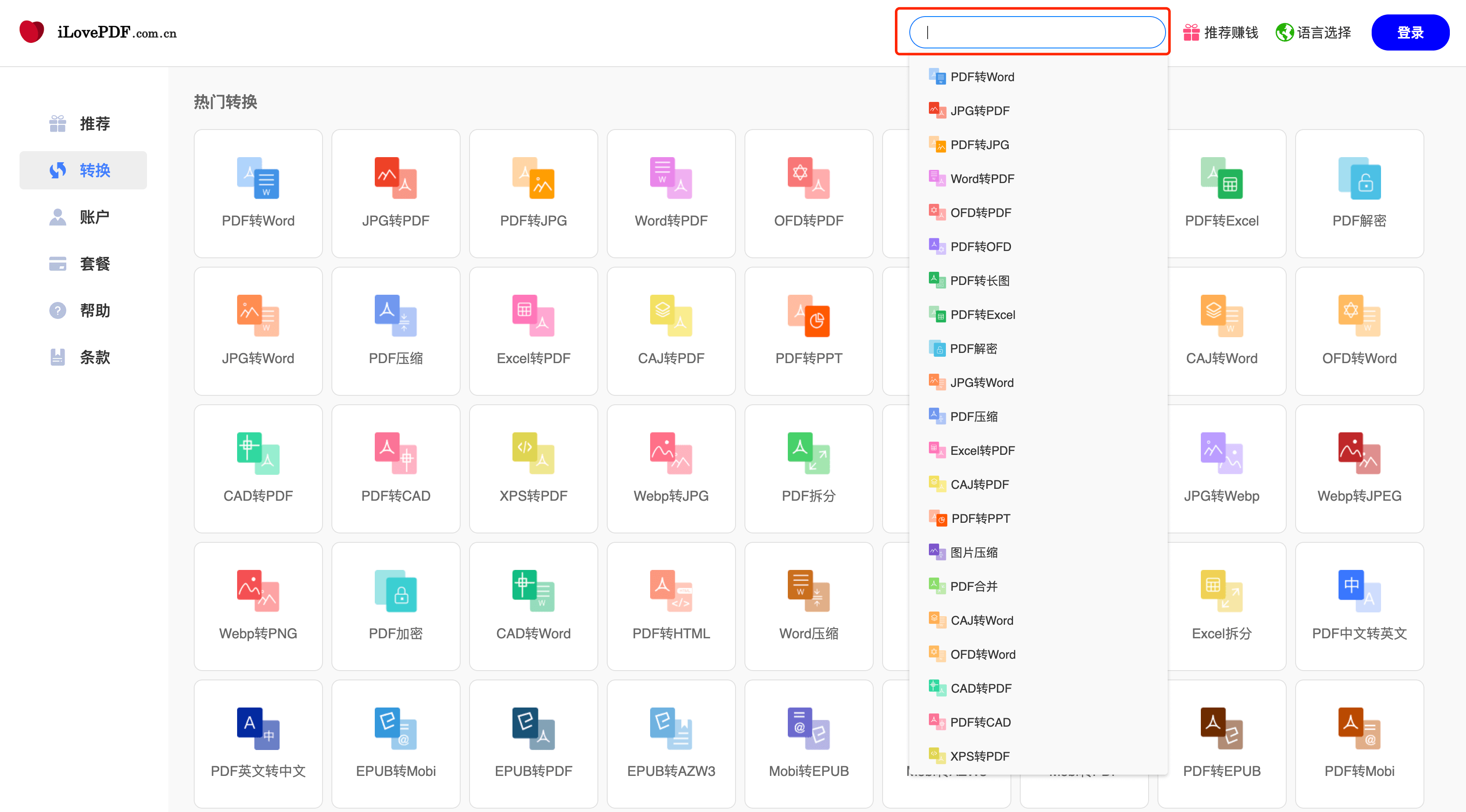 将鼠标定位在网站右上角的“搜索框”后,下拉选项中会显示常用转换格式,通过滑动滚动条可查看所有文档转换格式,点击选择即可快速进入转换。